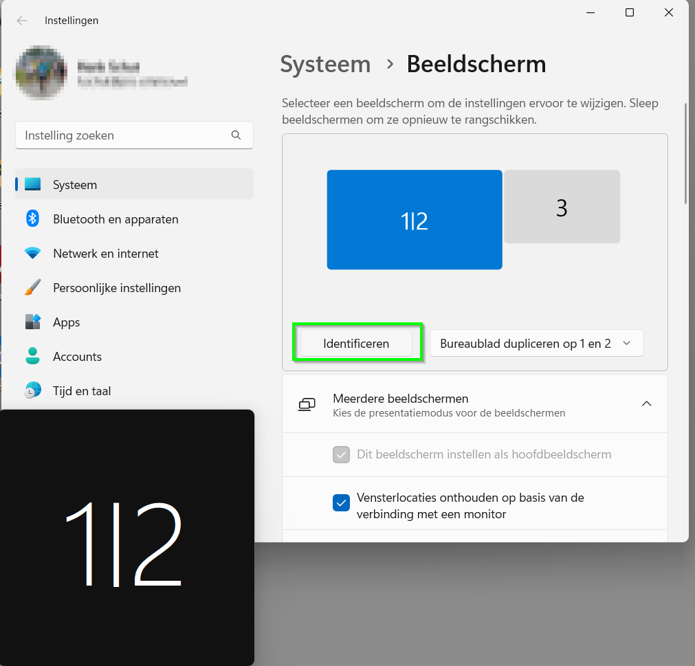 | Selecteer identificeren om te zien welk nummer bij welk scherm hoort. In dit voorbeeld is het laptopscherm gedupliceerd met het scherm op het bureau. Dit is zichtbaar aan het zwarte vak ‘1|2’ linksonder in het scherm. De beamer heeft het nummer 3. |
